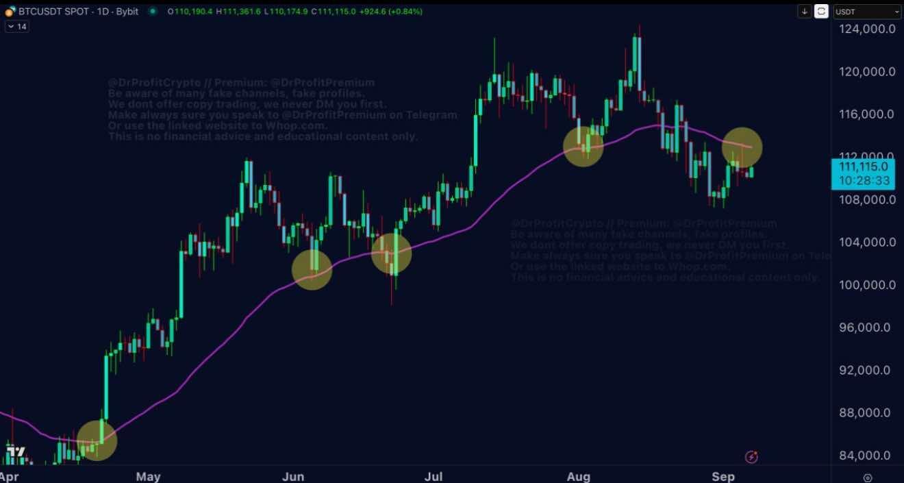 许多加密货币专家通常将EMA50的单日走势视为黄金分割线,因为它遵循着这种模式。6月、7月和8月,市场重新测试了该线并迅速反弹。但现在到了9月,它被突破并再次测试,将最强支撑位转化为阻力位。现在,EMA50被视为强劲阻力位,这清楚地表明我们正朝着大幅回调(即15%至25%)迈进。