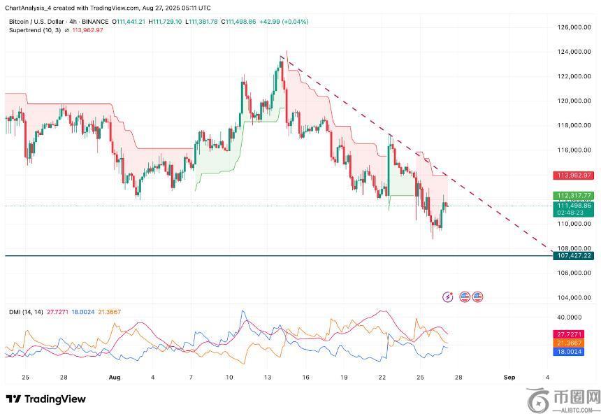 然而,动能有所减弱。RSI为41.8,反映出在自7月高点回落后,看跌情绪有所减弱。MACD仍位于信号线下方,凸显上行压力正在减弱。4小时图上,BTC价格受制于113,900美元附近的下行趋势线,上方存在超趋势阻力位。