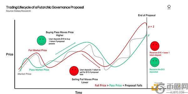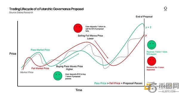 在这些提案市场中,任何人都可以参与交易,无需是该 DAO 的代币持有者。举例来说,即使你没有该 DAO 的代币,也可以用稳定币在提案的“通过市场”或“否决市场”中买入。