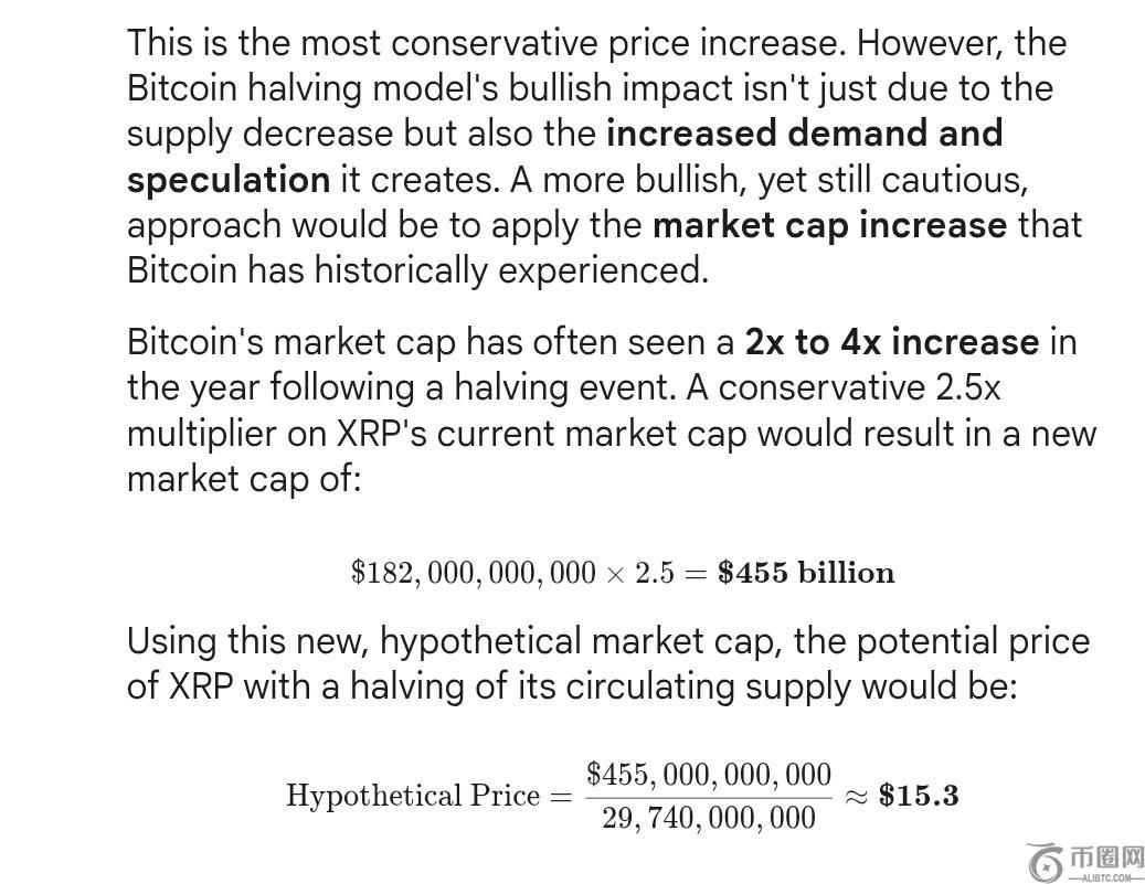 Gemini 以这段历史为指导,为 XRP 提出了更为乐观的前景。如果市值增长 2.5 倍至关于4550亿美元,供应量减半,价格可能达到15.30美元左右。Gemini 表示,与比特币减半后的爆炸性上涨相比,这个数字仍然比较保守。