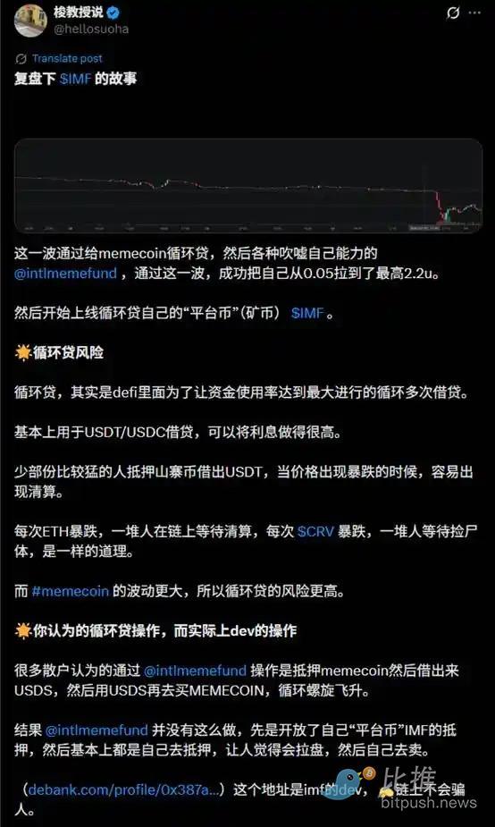 「梭教授说」则是通过链上的记录,更直接地质疑 IMF 团队自己抵押引发 FOMO 然后自己卖出代币套现: