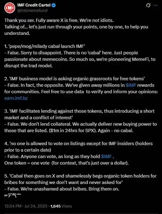IMF 很快对此进行了回击,声称并没有索要任何贿赂,上架借贷对的标准也是公开的并且由 $IMF 持有者进行投票: