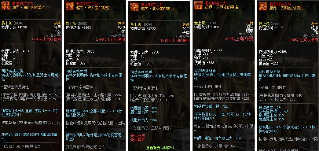 升级顺序为上衣、下装、腰带、护肩、鞋子,上衣提升率为4.5%,下装提升率为4%,腰带提升率为3.8%,护肩提升率为3.5%,鞋子提升率为2.9%。非常适合爆发类职业。
