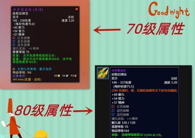 80级版本的辛多雷金杖其他属性都没有改变,唯一有变化的就是法术治疗变成了法术强度,由原来的550点法术治疗变成了293点法术强度,属性得到了压缩,是治疗和输出通用的武器。大家看上面的图片,可以自行对比一下两者的属性。