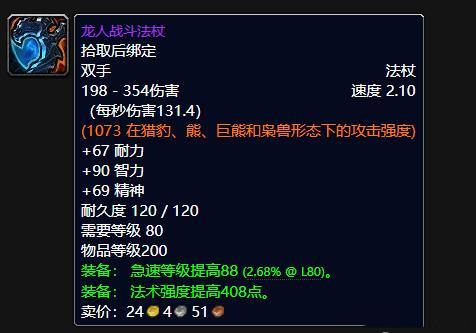 咱们再来看一下龙人战斗法杖的属性,白字属性是加67点耐力,90点智力,69点精神,绿字属性提高88点急速等级和408点法术强度。龙人战斗法杖比辛多雷金杖少了3个宝石插槽,却丝毫不影响它的属性碾压辛多雷金杖。大家一比较就可以得出结论,辛多雷金杖能否打团队副本,相信大家心里已经很透彻。