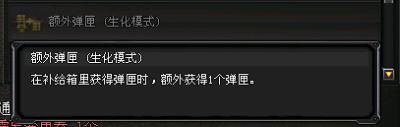 在生化模式中,佣兵通过生化补给箱获得主武器子弹填满时,会额外获得一个后备弹匣。