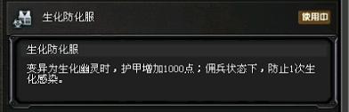 其实这个生化防护服角色强化属性的具体游戏效果,跟我们大家熟知的防化服是一模一样的,只是说当具体这个角色强化属性以后,你就相当于是自带了一件防化服,只不过这个生化防化服角色强化属性的游戏效果是不能同防化服道具叠加的。