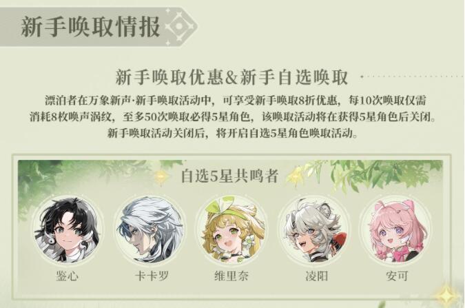 鸣潮新手卡池中,玩家可以从五个自选角色中任选一个直接获得。可以选择的角色分别是鉴心、卡卡罗、维里奈、安可和凌阳。下面为大家分析一下这几个角色的强度定位,玩家们可以参考以下的介绍来决定具体选择哪个角色.