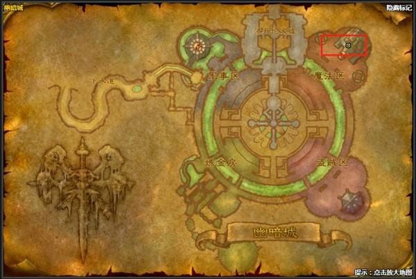 3、幽暗城传送门训练师位于,幽暗城中魔法区的位置,如上图之中所示,具体坐标为84.2,15.6,名字叫莱克斯顿莫泰姆传送门训练师。