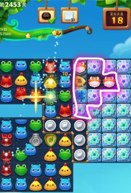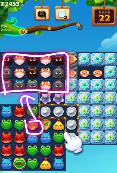 这一关定开局交换左侧青蛙和河马的位置,可以点亮魔法石,然后继续交换小动物消除魔法药水为魔法罐充能;魔法罐能量满之后,再次利用左侧的小动物形成连续的三消以及三消点亮魔法石消除魔法罐释放气鼓鱼并消除;