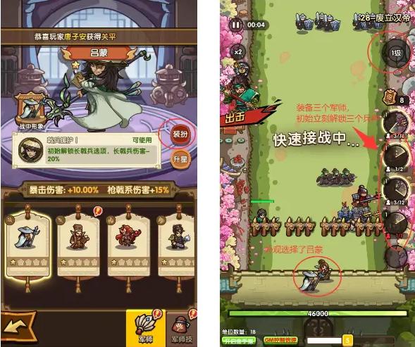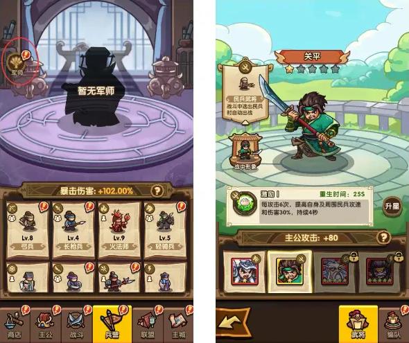 3、装备与军师:武将装备强化优先级高于等级,军师系统可提供暴击加成,激活后即使不上阵也生效。