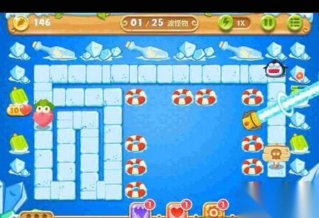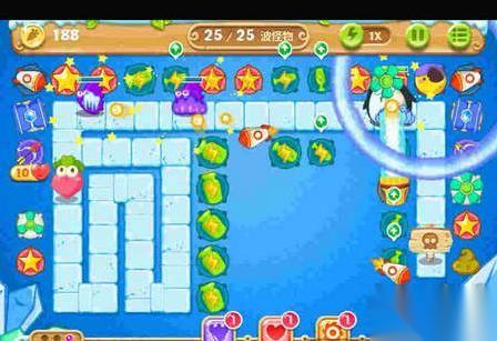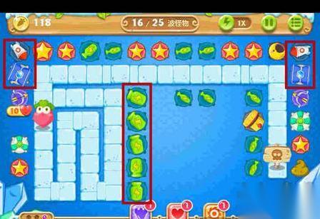 2、选择升级的炮塔是很关键的,玩家在游戏的前期需要升级的有火箭炮和冰锥塔来保证小怪不会侵犯到萝卜,同时为清除屏幕上的道具提供了保障。与此同时也要对中间的瓶子炮进行升级,才能有足够的火力去消除怪物;