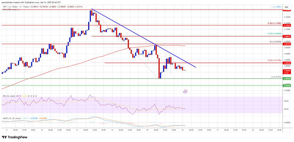 XRP 价格开始在 3.120 美元以下进行下行修正,例如比特币和以太坊。价格跌破 3,050 美元水平,进入短期看跌区域。