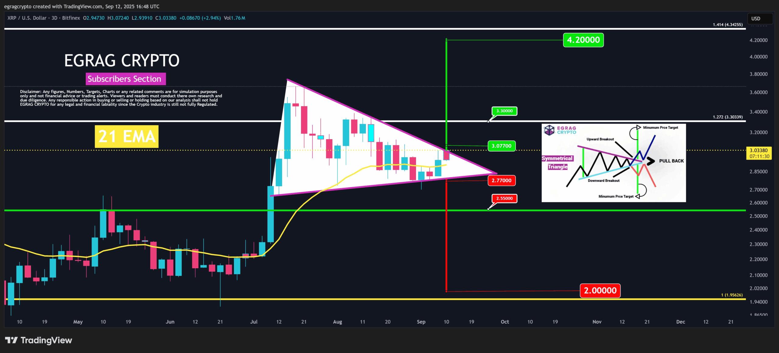 分析师 EGRAG CRYPTO 也表达了类似的观点,他表示瑞波币的下一个阻力位在 3.3 美元。如果瑞波币突破该水平,其下一个目标可能是 4.2 美元。