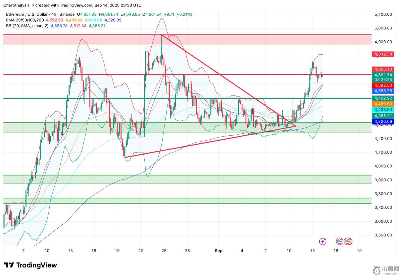 上行目标依然清晰。如果 ETH 能够突破 4,665 美元,则有望上探 4,812 美元,并进一步挑战 5,000 美元的心理关口。突破该区域则可能确认周期突破的判断,并延续涨势,目标指向 5,200 美元。