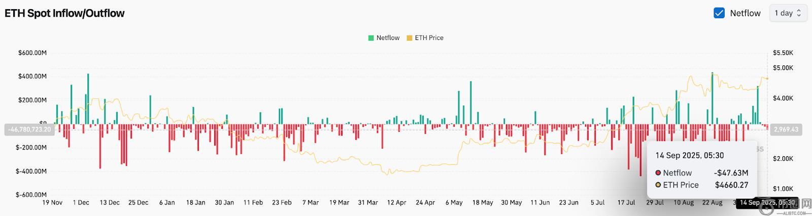 尽管技术突破,但链上资金流出仍显露出谨慎的迹象。数据显示,9月14日净流出4760万美元,表明部分投资者获利了结。这与看涨的图表走势形成鲜明对比,凸显了短期持仓风险。