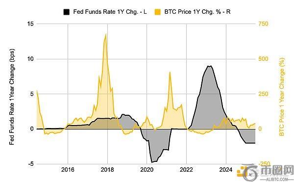 第一项研究比较了美国联邦基金利率的同比变化与比特币价格的同比变化。分析显示,两者之间没有明显的负相关性。