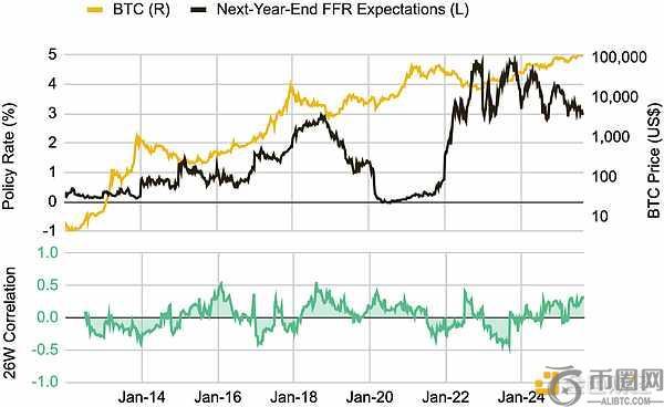 第二项分析利用利率期货市场数据来衡量市场对未来利率变化的预期,并分析了其与比特币价格六个月的相关性。结果显示,两者之间的关系极不稳定,表明市场对利率变化的预期几乎无法解释比特币价格的任何线性波动。
