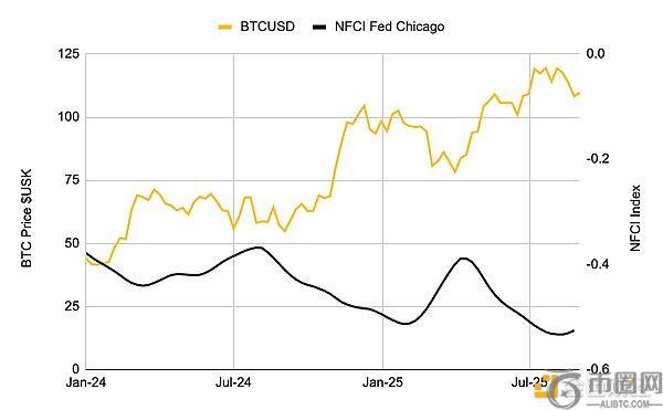 Binance Research 指出,流动性是关键所在。他们提到:“芝加哥联邦储备银行全国金融状况指数(NFCI)的历史数据显示,该指数的紧缩程度与比特币价格波动之间存在相对明显的负相关性。近期该指数呈现上涨趋势,值得市场警惕。”