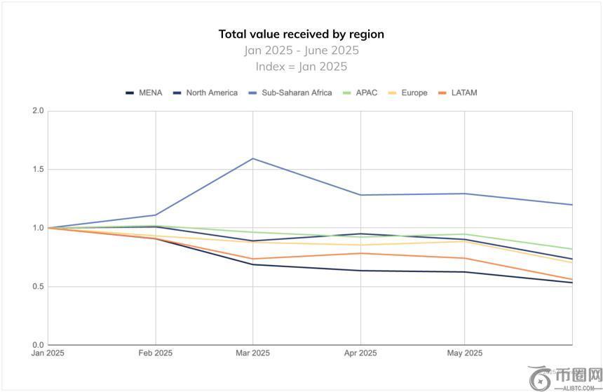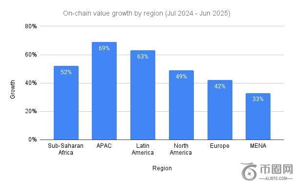 拉丁美洲也呈现出63%的强劲增长,加密货币在该地区被广泛用于汇款和P2P支付,尤其是在巴西和墨西哥。与此同时,北美和欧洲凸显了机构的作用。北美在ETF和托管服务的推动下达到了1.2万亿美元的规模,而欧洲则达到了1.1万亿美元的规模,主要集中于DeFi和监管框架,例如MiCA。