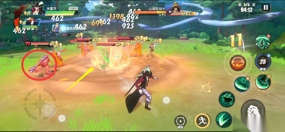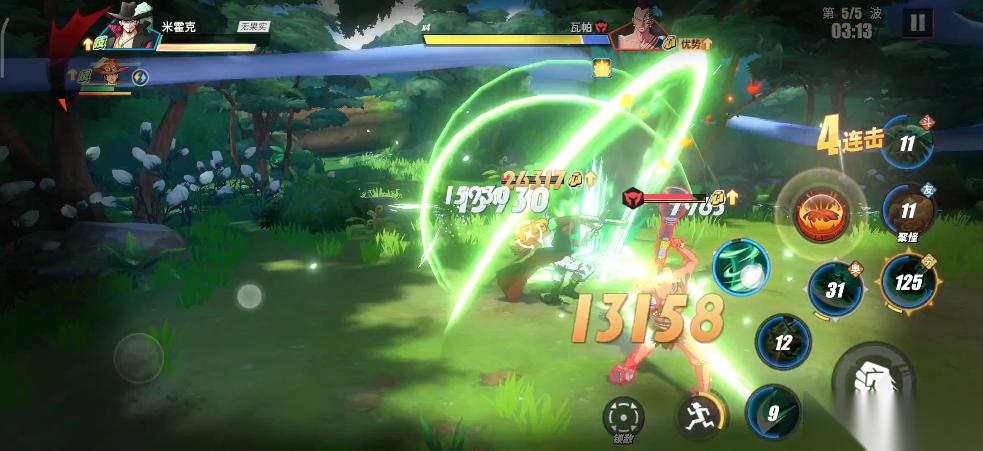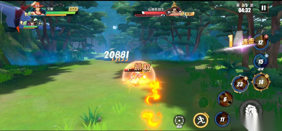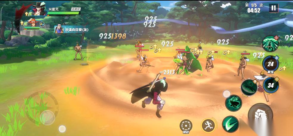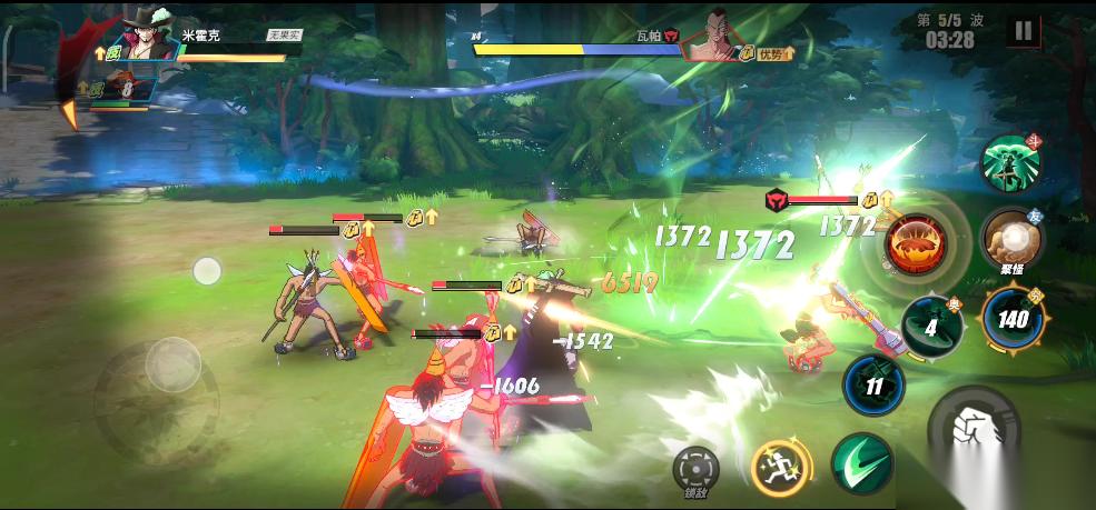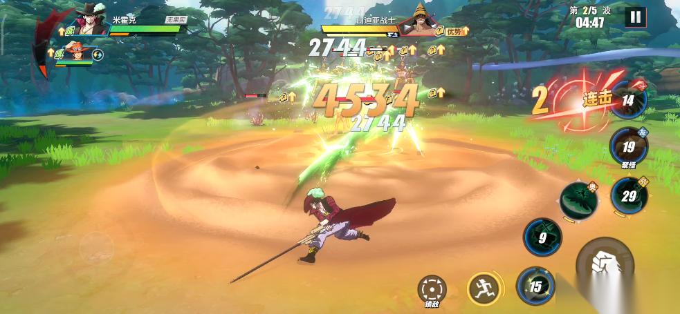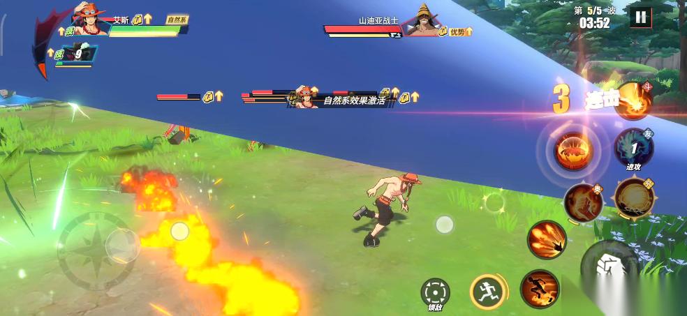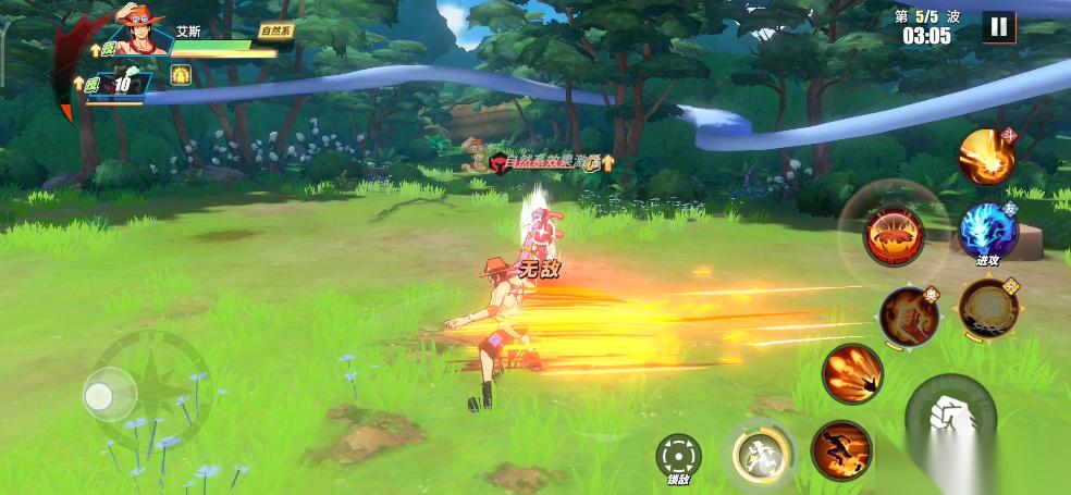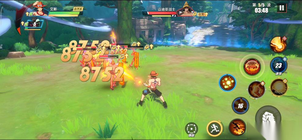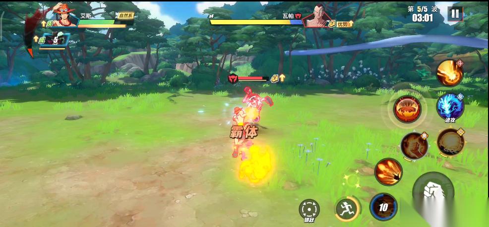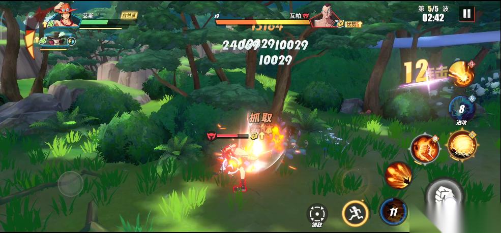 实战中,只要BOSS瓦帕登场,我们就利用鳄鱼助战技能将所有敌人聚集起来,接着直接使用鹰眼的究极奥义。所有敌人被击倒之后,我们在释放鹰眼连招,这样就可以无伤输出。前面我们积攒的能量可以在这里一起释放了,鹰眼连招打完,立刻丢出普通奥义,接着替换艾斯远距离再消耗一套。