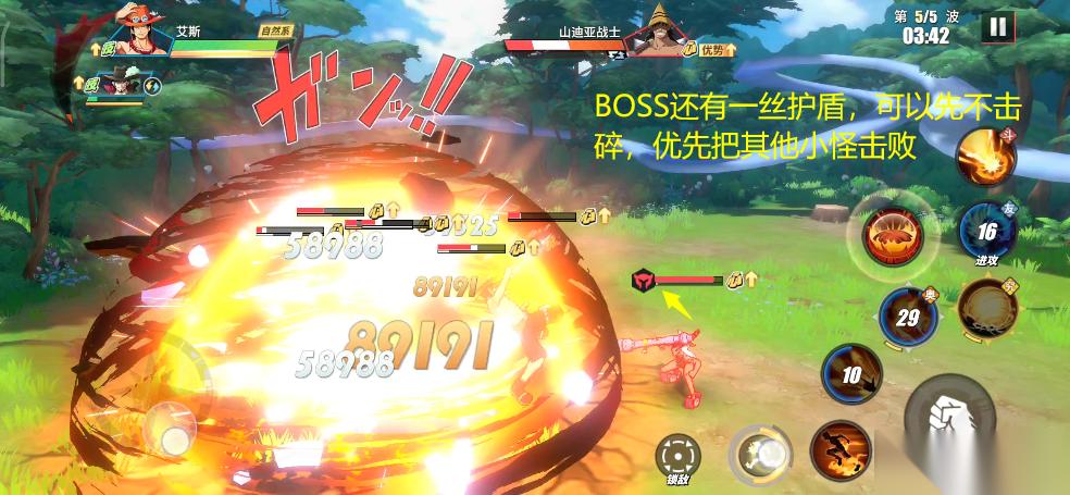 这一整波攻击结束后,敌人基本上被消灭的差不多了。这时先不要急着近身攻击,可以等BOSS释放完一波技能后再进行反击。(BOSS如果无护盾保护,近身随意攻击)