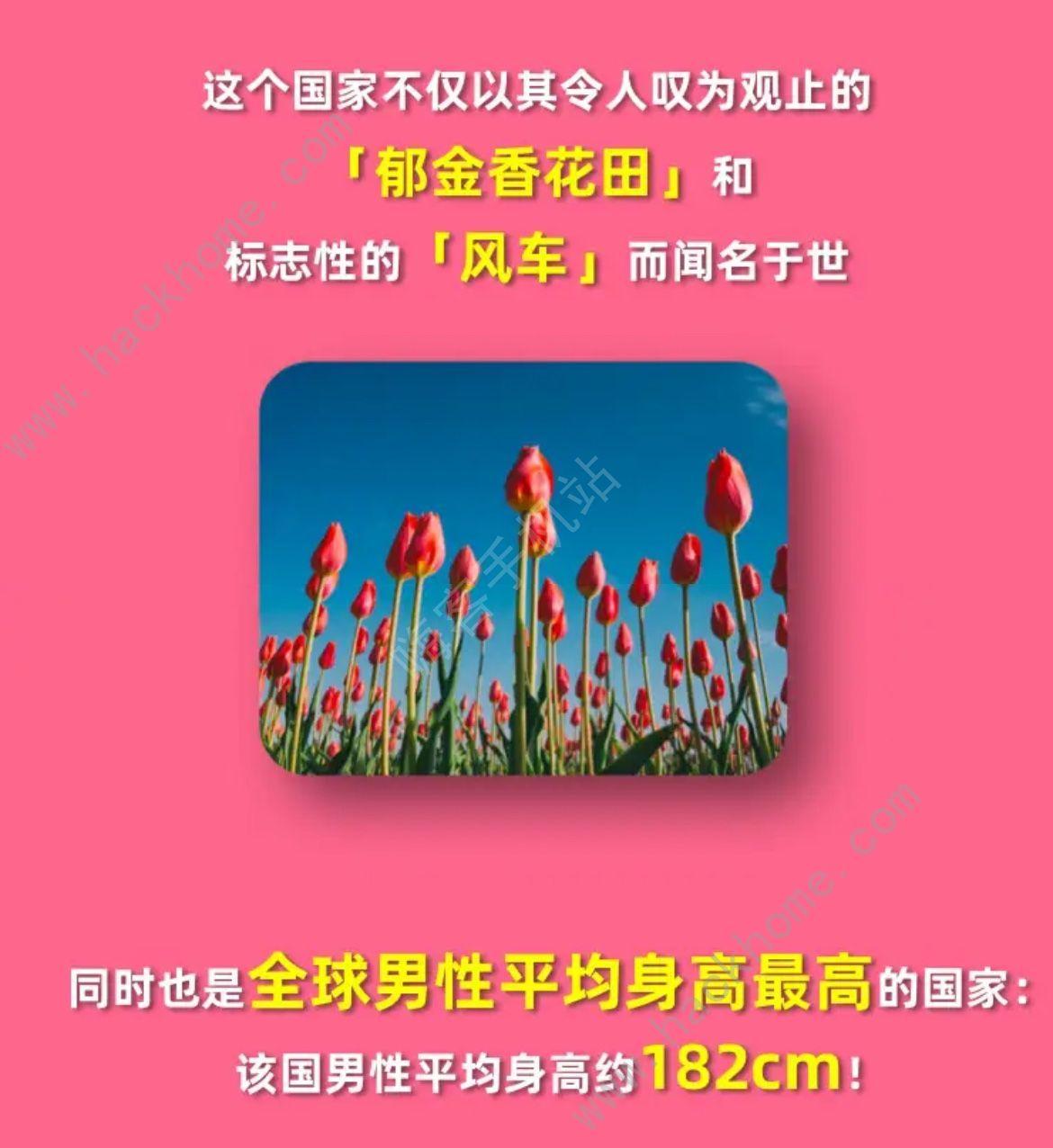 提示:进来找线索,发现介绍了郁金香花田和风车,那么这个国家就是荷兰哦。