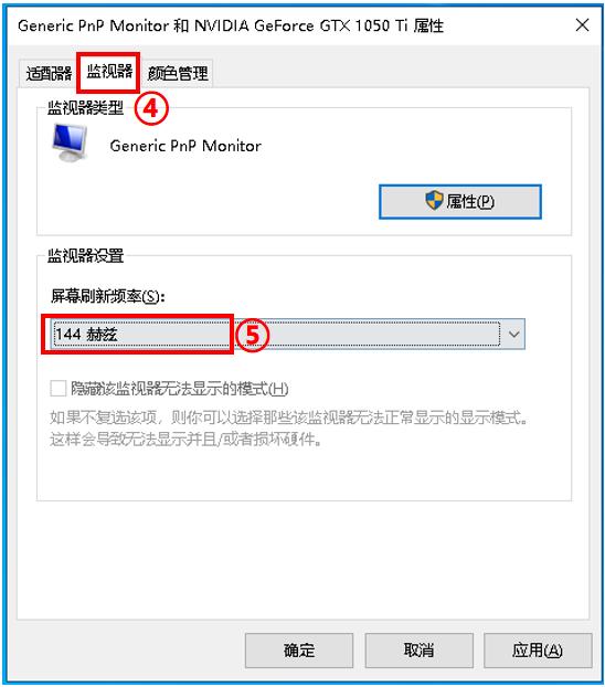 4.”最后点击“监视器”,把屏幕刷新频率设置为144Hz/165Hz或更高,最后应用并确认即可。(应用过程会黑屏大概5秒左右的时间,属正常现象)