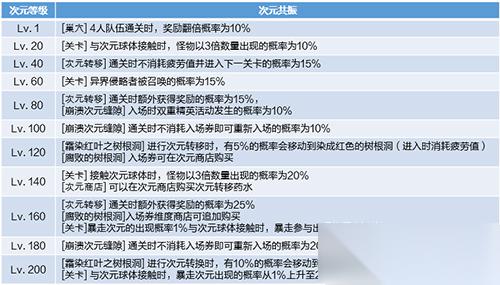 随着版本更新,次元等级增加到Lv.200,同时次元等级达到Lv.100后,将新增[次元共鸣]。在特定次元等级,可享受次元共鸣带来的例如:奖励翻倍概率提升、[次元转移]通关时额外获得奖励概率提升、 暴走次元出现概率提升等不同特权。