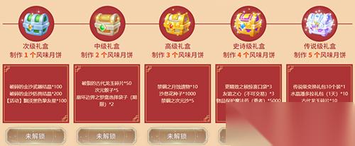 累积风味月饼解锁对应月饼宝箱可获得传说级变换礼包、潘多拉礼包、古代龙玉碎片、物品保护魔法药(勇者)等好礼。与G友共享团圆时光,收获满满福利!