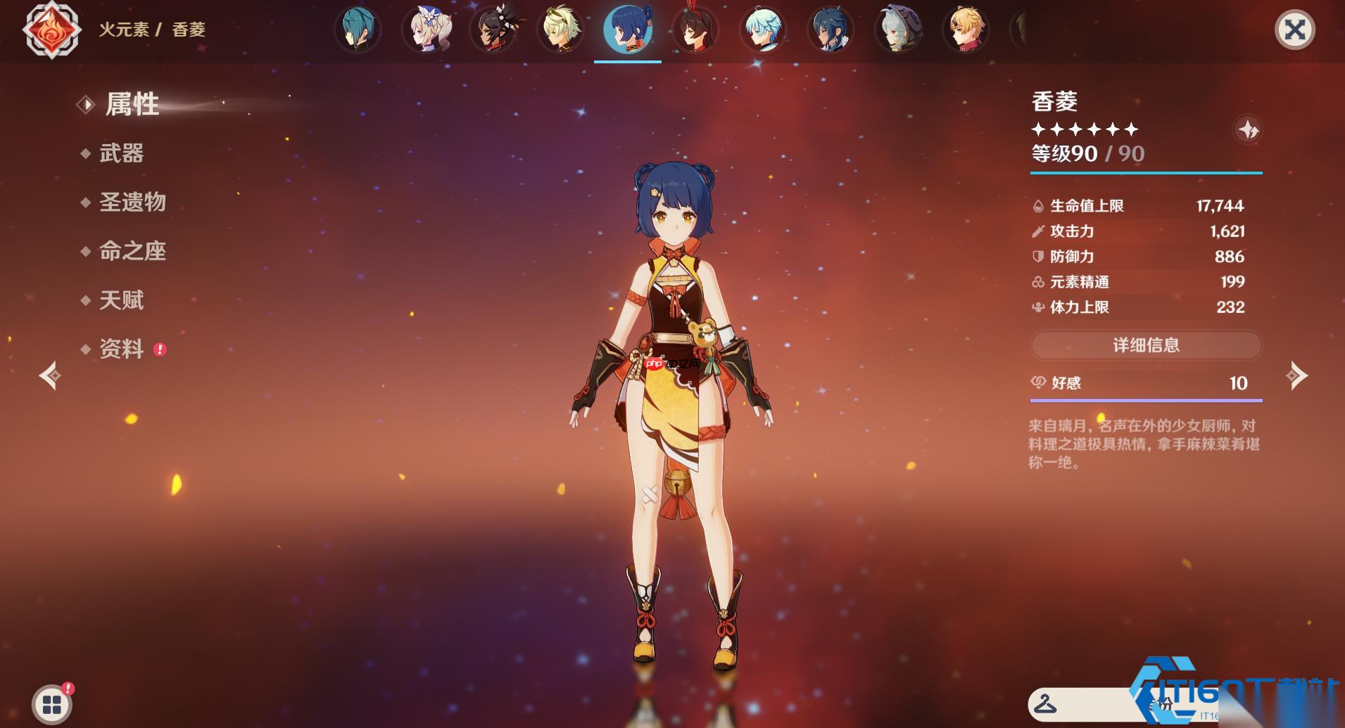 牢记香菱定位:顶级火副C / 脱手挂火工具人。核心使命: