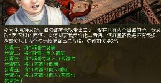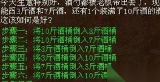 1.在游戏中,倒酒方式一共有两种。第一种是酒家能舀3斤酒和7斤酒,还有1个装满了10斤酒的酒桶,操作步骤一共六步,具体的操作步骤如下图所示。