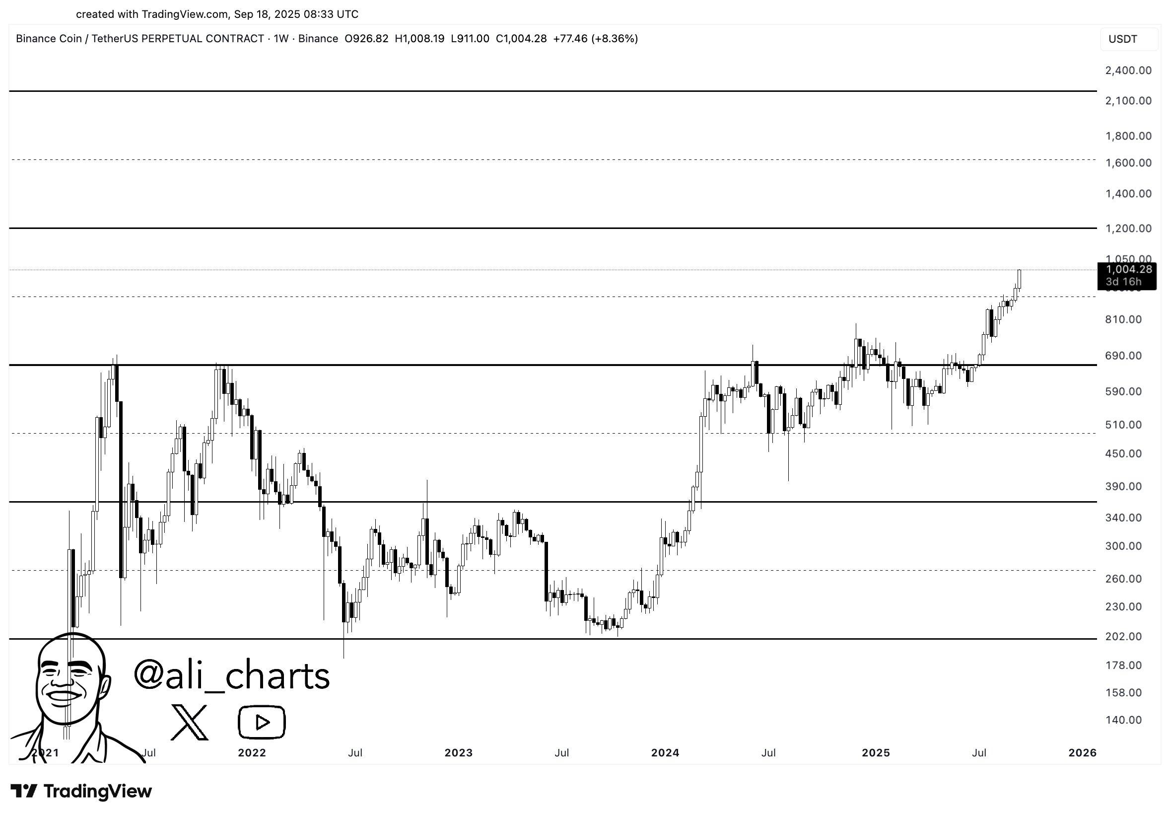 - BNB 价格突破 1,000 美元,创下新高,短期目标设定为 1,200 美元,潜在上涨空间超过 2,100 美元。