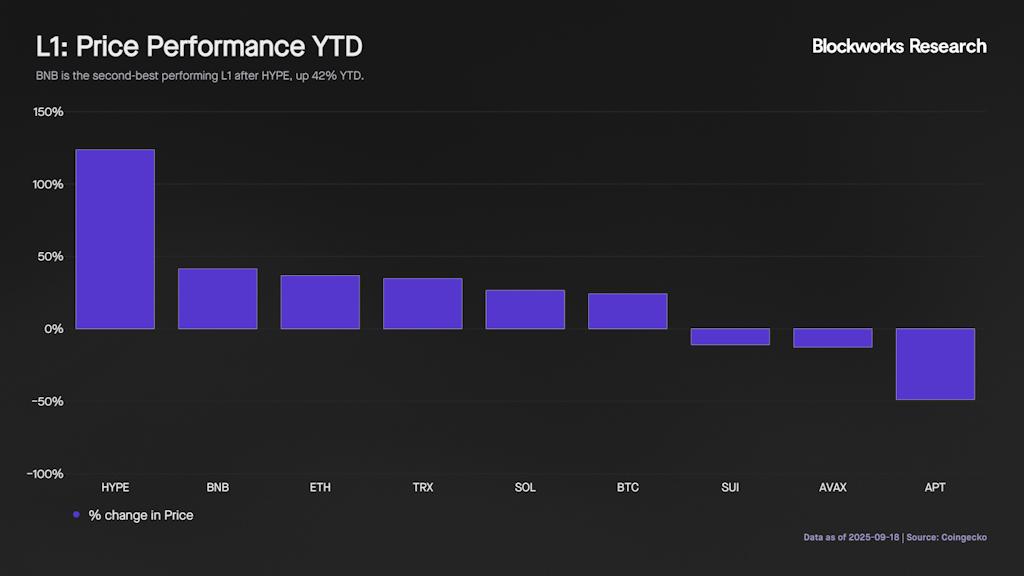 本周表现突出的主要货币是BNB,过去七天上涨超过10%。虽然BNB经常被忽视,但它今年悄然实现了强劲的回报,超越了大多数一级货币,排名仅次于HYPE。