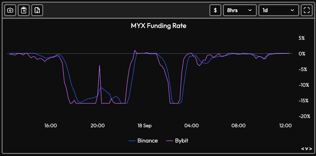 尽管存在这种脱节,做空 MYX 几乎是不可能的。该代币的供应量似乎被紧紧控制,融资利率仍然处于负值状态(每八小时 -20%),即使价格上涨,做空者也依然会受到惩罚。从历史上看,价格与融资利率之间的这种背离并不常见,但 TRB 和 AUCTION 等资产也曾出现过类似的情况,它们也经历了大幅、流通量稀少的反弹。