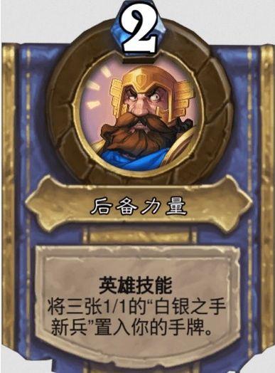 技能2后备力量,2费,将三张1/1的“白银之手新兵”置入你的手牌,效果等同旱谷狱卒亡语。解锁条件:装备10把武器