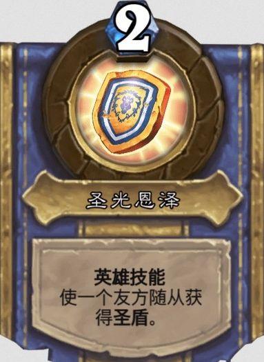 技能3圣光恩泽,2费,使一个友方随从获得圣盾,效果等同保护之手。解锁条件:失去25次圣盾。