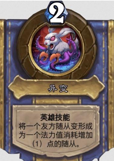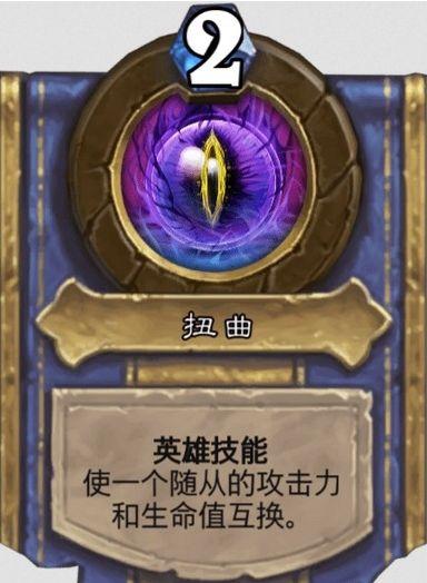 技能2扭曲,2费,使一个随从的攻击力和生命值互换,效果等同引力翻转。解锁条件:恢复50点生命值