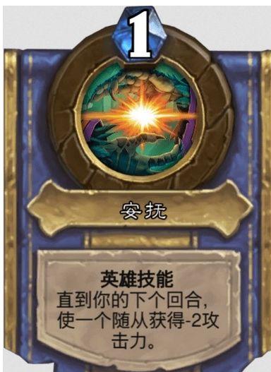 技能3安抚,1费,直到你的下个回合,使一个随从获得-2攻击力,效果等同缩小射线工程师战吼。解锁条件:施放50个法术