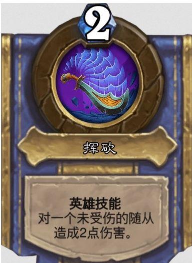 技能3挥砍,2费,对一个未受伤的随从造成2点伤害,效果等同背刺。解锁条件:抽取100张卡牌