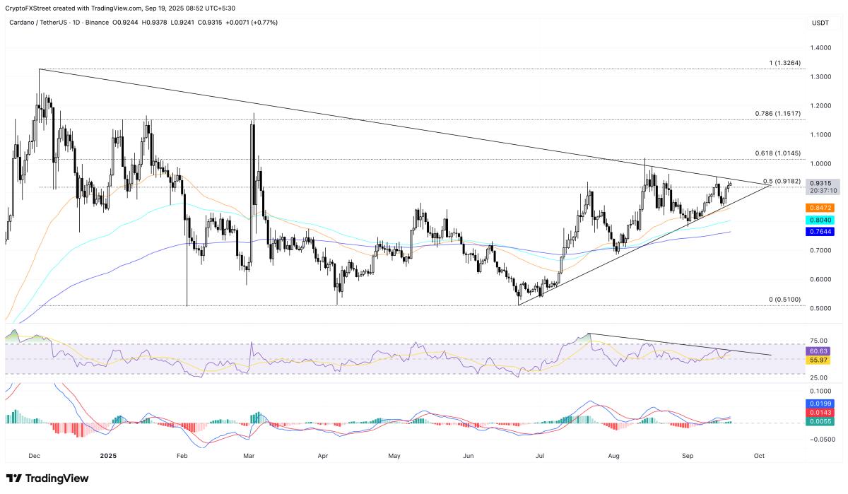 ADA 价格周五上涨近 1%,连续第四天上涨。此外,该目前正在测试日线图上对称三角形形态的上趋势线,接近 0.95 美元。