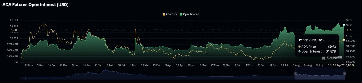 - ADA 价格继续保持上涨势头,交易价格接近 0.90 美元,交易量激增,衍生品未平仓合约达到 18.7 亿美元。