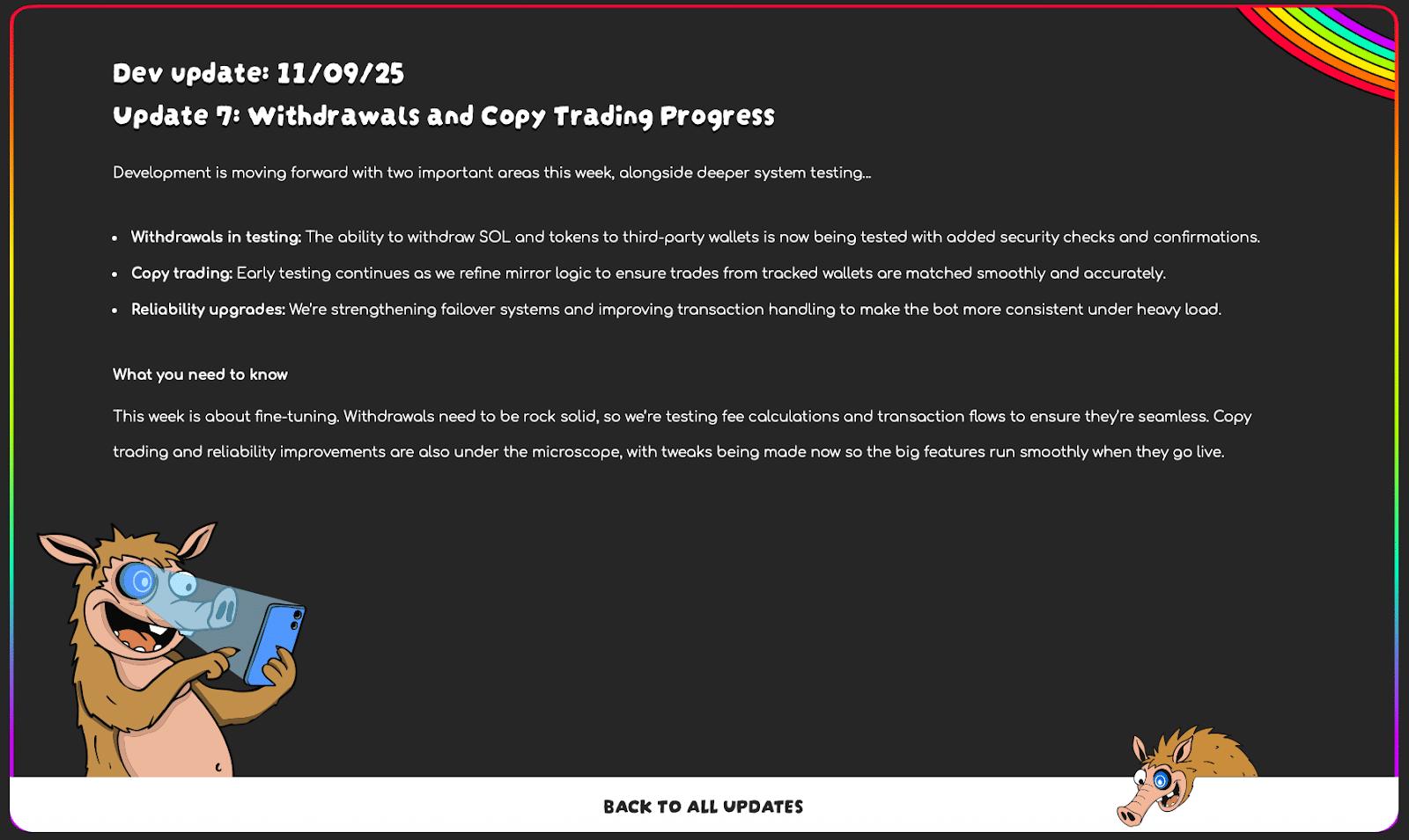 最新更新显示,路线图的各个部分正在成为现实,其中 MEV 保护、自动复制交易和扩展的 DEX 支持等功能已经成形。