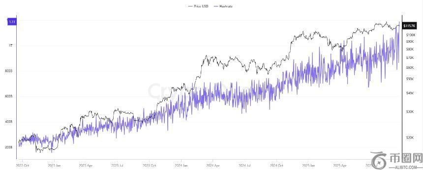 与此同时,哈希率(区块链网络计算能力的指标,基于每秒猜测的次数)已突破万亿大关,竞争愈发激烈。