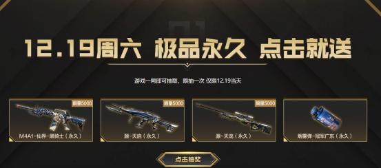 12.19周六 极品永久 点击就送!小伙们在12.19日当天游戏一局,即可在包含四款极品道具的奖池中,抽取一件永久道具补给!M4A1-仙界-黑骑士(永久)、源-天启(永久)、源-天龙(永久)、全新投掷道具烟雾弹-冠军广东(永久)直接抽!