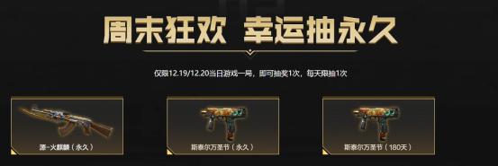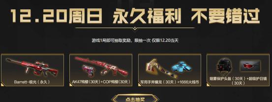 12.20周日 永久福利 不要错过!小伙伴们在12.20日任意游戏一局,即可在参与奖池抽奖!Barrett-极光(永久)、AK47绚樱(30天)+COP绚樱(30天)、军用手斧耀龙(30天)+1666火线币、烟雾保护头盔(30天)+超级护目镜(30天)四大奖励仅限12.20当天哦!