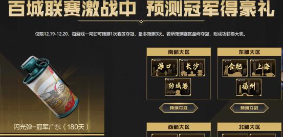 百城联赛激战中 预测冠军得豪礼!小伙伴们在12.19~12.20日,参与活动每天游戏一局即可预测1次赛区夺冠,最多预测3次!若所预测赛区最终夺冠,则成功解锁大奖全新专属投掷闪光弹-冠军广东(180天)哦!