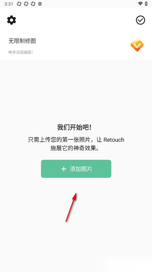 1.在手机上找到Retouch手机版这款软件,在页面上找到显示的【添加照片】选项,将其点击打开。