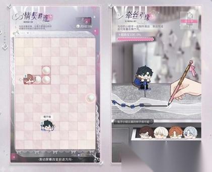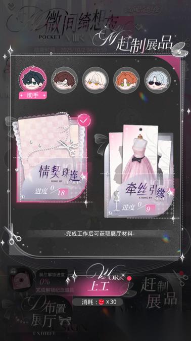 每日参与3次[赶制展品],可在[赶制展品]界面自由选择[情契珠连]或[牵丝引缘],与他一起制作展品,共同完成创作!