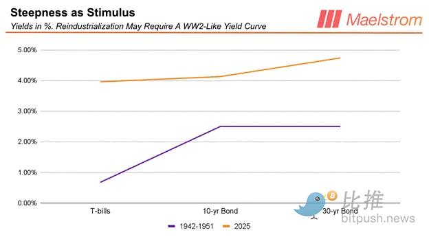 巴法罗·比尔·贝森特(Buffalo Bill Bessent)提出的“再工业化美国”计划,以及试图阻止“美式和平”(Pax Americana)从准帝国逐渐滑落为单纯强大民族国家的必然趋势,其实并不新鲜。二战的紧迫形势让财政部在 1942 至 1951 年间接管了美联储。贝森特计划的一部分,就是重塑收益率曲线,也就是所谓的收益率曲线控制(YCC)。那么,当年收益率曲线长什么样?与今天相比又有何不同?